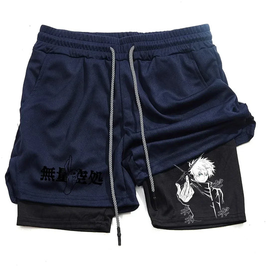 Pantalones cortos de compresión de Anime para hombre, ropa deportiva de verano, 2 en 1, entrenamiento, Fitness