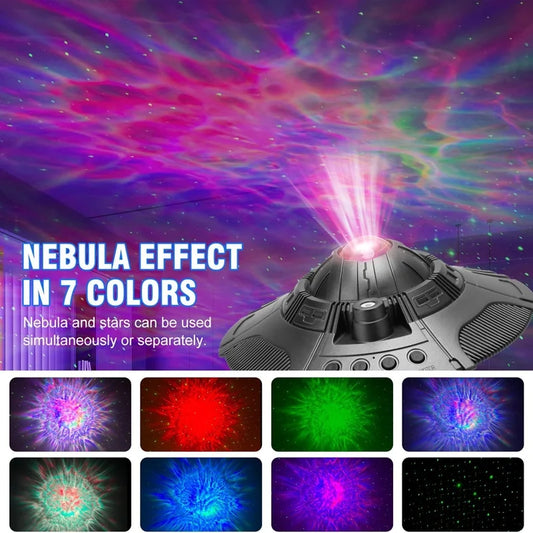 Proyector de galaxia con luz nocturna y cielo estrellado.