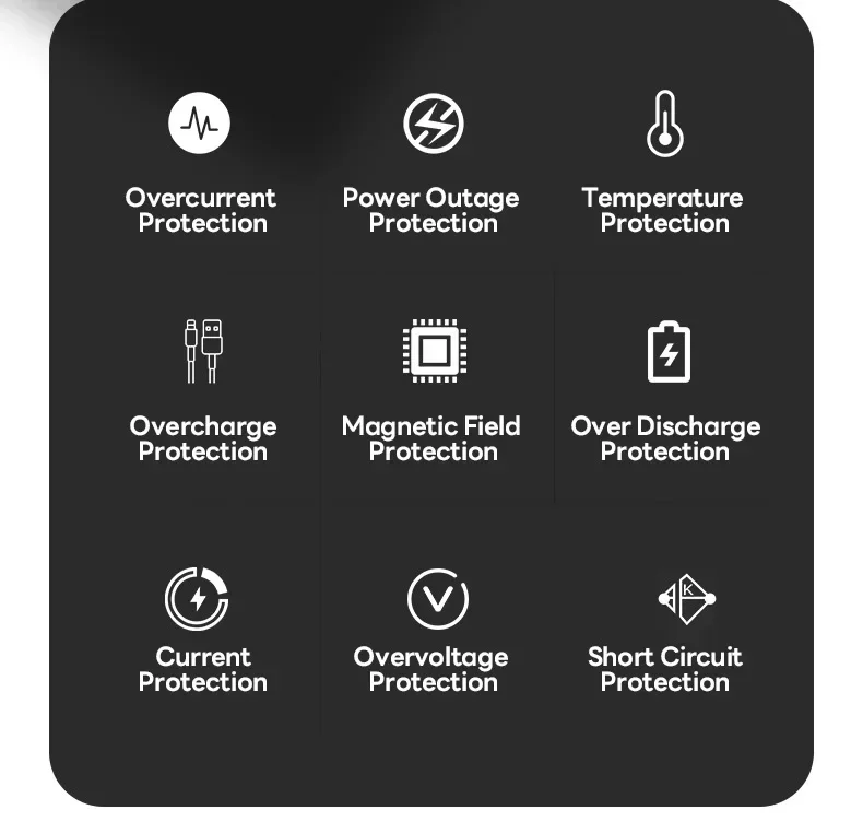 Protección contra sobrecorriente, protección contra sobrepotencia, protección contra sobretensión, protección contra sobrecarga, protección contra cortocircuitos, protección contra sobredescarga, protección de temperatura, protección de campo magnético, protección de reinicio, protección de circuito, protección antirretroceso, apagado automático